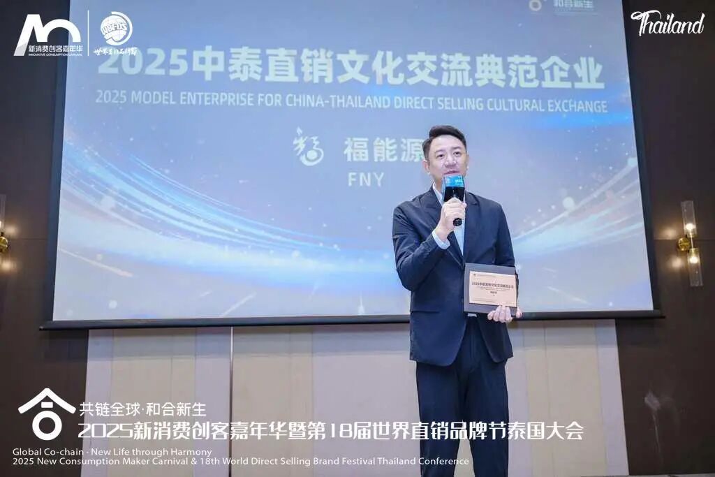 会议期间,李南总裁与嘉宾共同开启了“2025新消费品牌节暨第18届世界直销品牌节泰国大会启动仪式”。福能源更是凭借多年来在泰国持续开展高品质海外交流活动,推动中泰大健康文化交流的实践,被授予“2025中泰直销文化交流典范企业”荣誉称号,李南总裁代表公司领奖并发言。